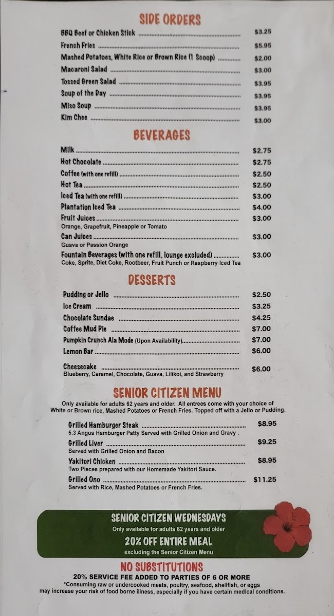 - Main Plates and Soups: Features items like Oxtail Soup, Beef Stew with green beans, Lau Lau Plate, Chicken Cutlet with gravy, Portuguese Beans Soup, and Won Ton Mein with vegetables.