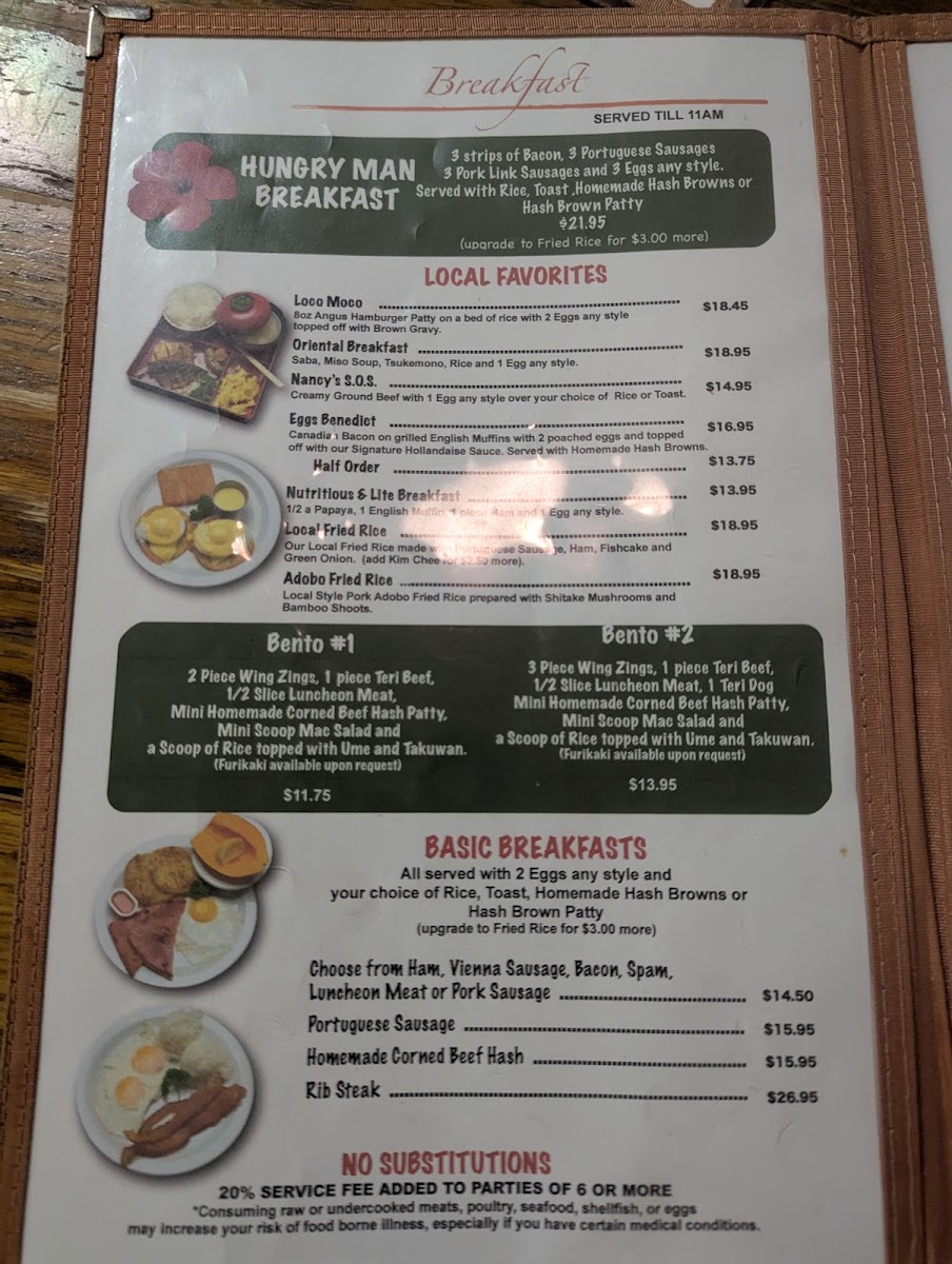 This menu accommodates a variety of dining needs, suitable for quick orders as well as family gatherings. The diverse offerings provide options for those seeking local flavors as well as familiar American dishes throughout the day.