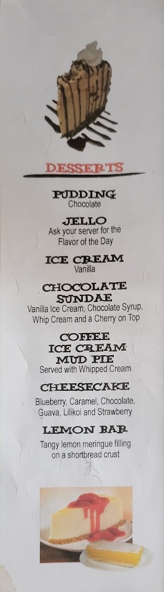 - Desserts and Drinks: Highlights include the Famous Mud Pie and Lemon Jell-O, along with beverage options like Margaritas.